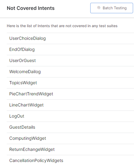 This feature helps identify the intents not covered so as to include them in the test data for better and holistic testing of the assistant. Click the three-dot menu on the right side of the panel to view the list of intents not covered in batch testing.