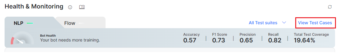 The Flow Health metrics display all the test suite results from the conversation testing and present insights into your test cases with performance analytics. Learn more.