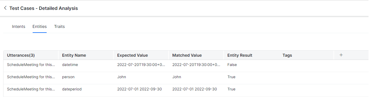 - Entity Name: The entity name mapped to the test case for the utterance.