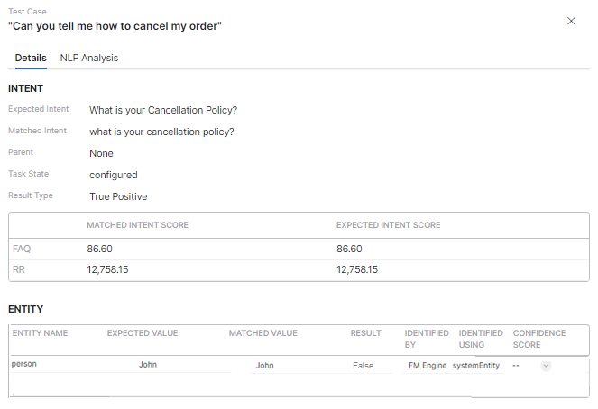 - View the expected and matched results, and the detailed NLP analysis.