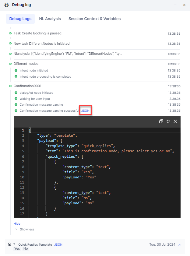 Debug Log provides the sequential progression of a dialog task and context and session variables captured at every node. It's a chat-like interface, grouped by user inputs and app responses for easier conversation flow tracing. It offers improved navigation and contextual information at a glance. This significantly enhances log readability and streamlines the debugging process. The Debug log supports the following statuses:
