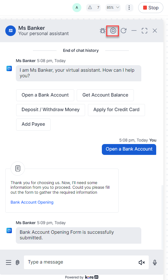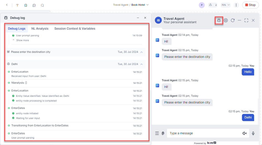 You can open a debug window to view the natural language processing, logs, and session context, and variables of the chat. To open the debug, click the Debug icon