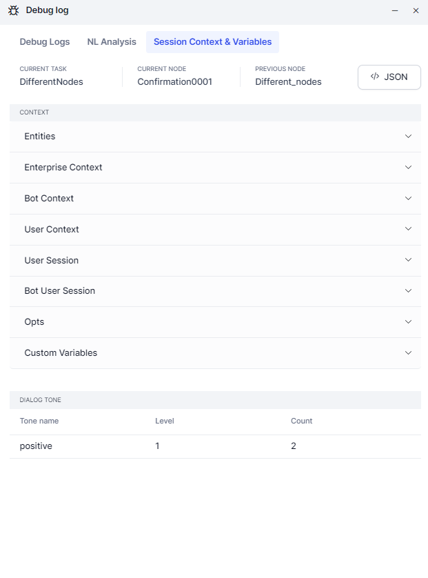 The Session Context & Variables tab displays dynamically the populated Context object and session variables updated at each processed component in Dialog Builder. The following is an example of the Session & Context Variables panel in Debug Log. For more information about the parameters, see Using Session and Context Variables in Tasks and Context Object.