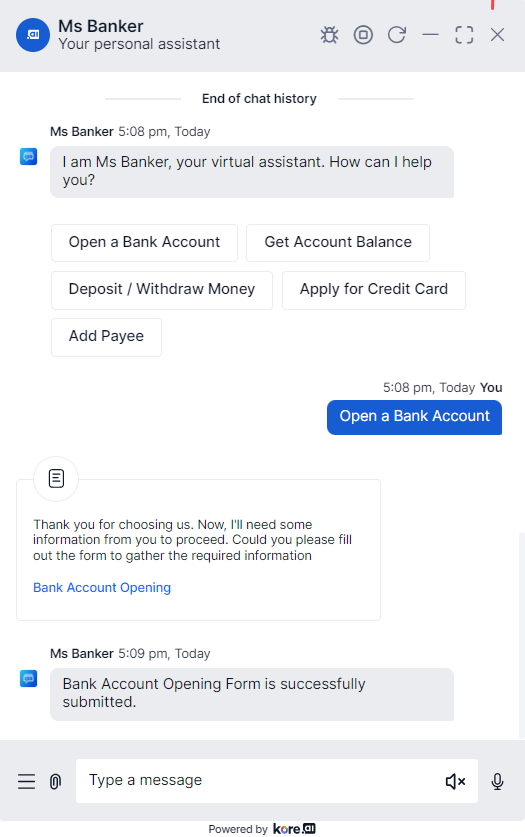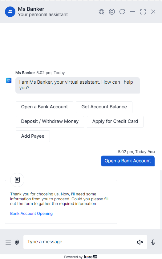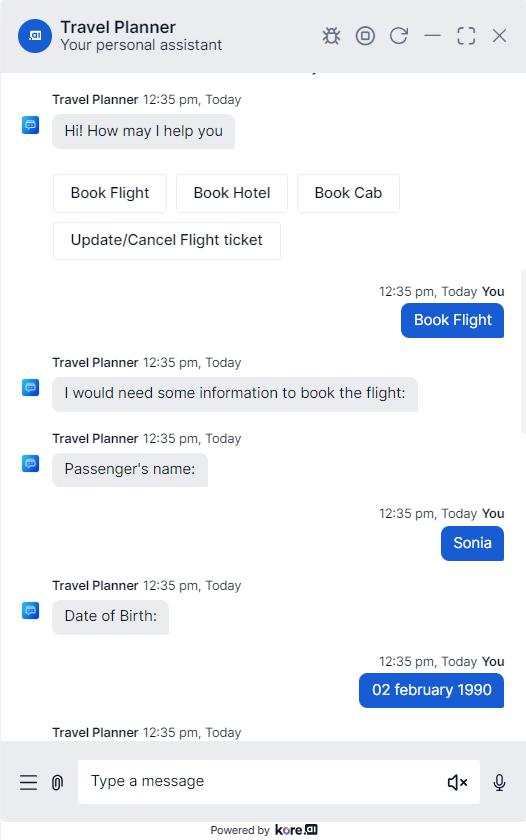 When you first open the window, you need to select whether you wish to proceed with Voice or Chat. Chat experience is described in this content. In the Message section, enter text to begin interacting and testing your app, for example, Book a flight. The NLP interpreter begins processing the task, verifying authentication with the user and the web service, and then prompting for required task field information. When all the required task fields are collected, it executes the task. While testing your app , try different variations of user prompts and ensure the NLP interpreter is processing the synonyms (or lack of synonyms) properly. If the app returns unexpected results, consider adding or modifying synonyms for your tasks and task field names as required. For more information, see Natural Language Processing.