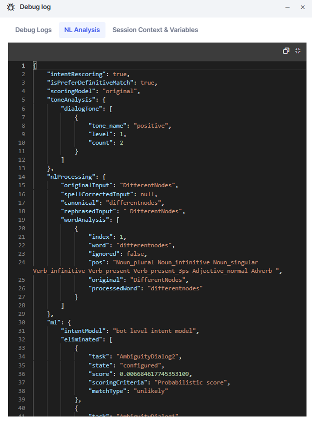 NL Analysis tab shows the task name analysis and recognition scores of each user utterance. It presents a detailed tone analysis, intent detection, and entity detection performed by the NLP engine. As a part of intent detection, the NL Analysis tab shows the outcomes of Machine Learning, Fundamental Meaning, and Knowledge Graph engines. For a detailed discussion on the scores, see Training Your Assistant topic.