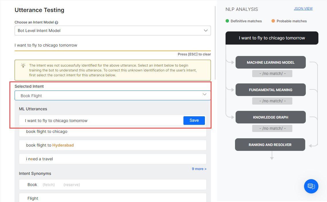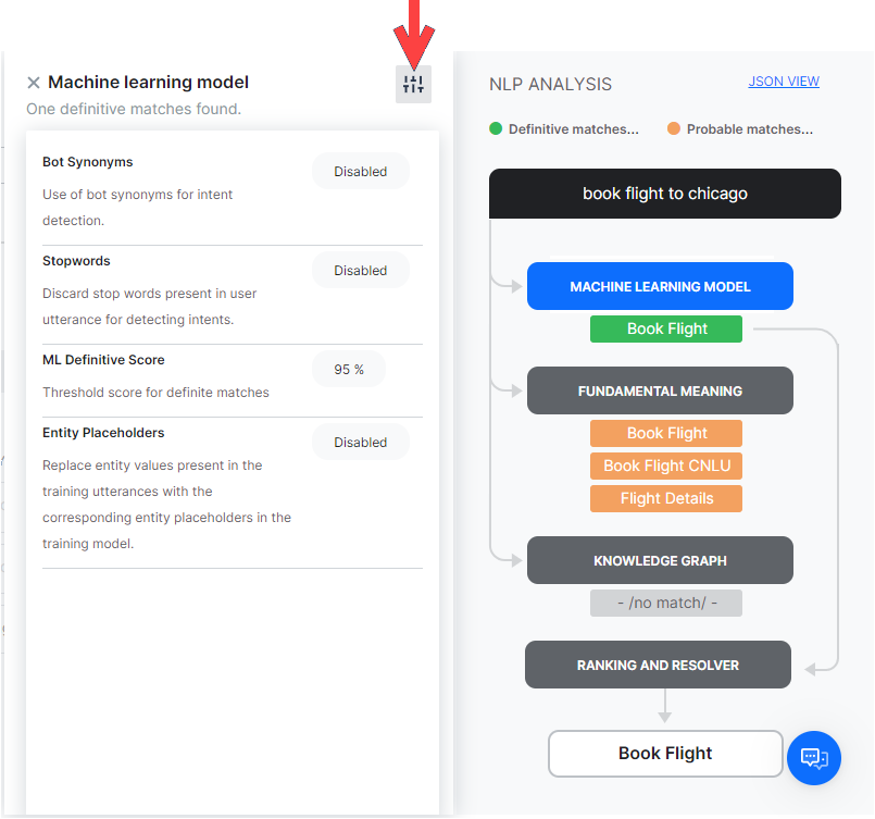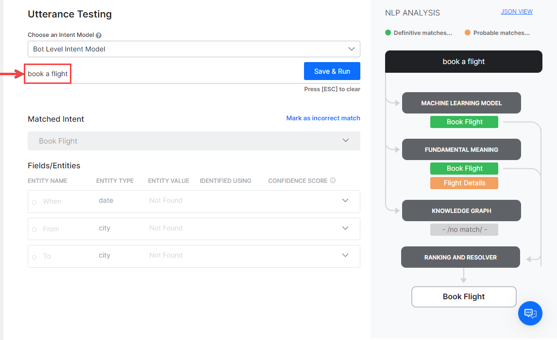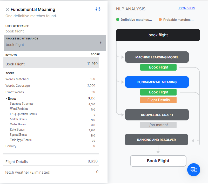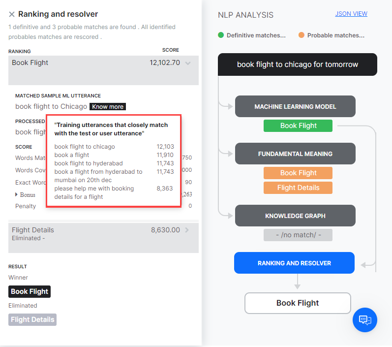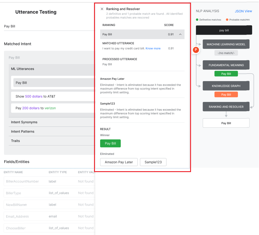 When you test a user utterance, in addition to the matching intents you will also see an NLP Analysis box that provides a quick overview of the shortlisted intents, the NLP models using which they were shortlisted, corresponding scores, and the final winner.