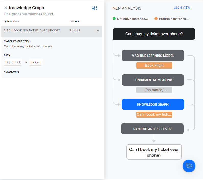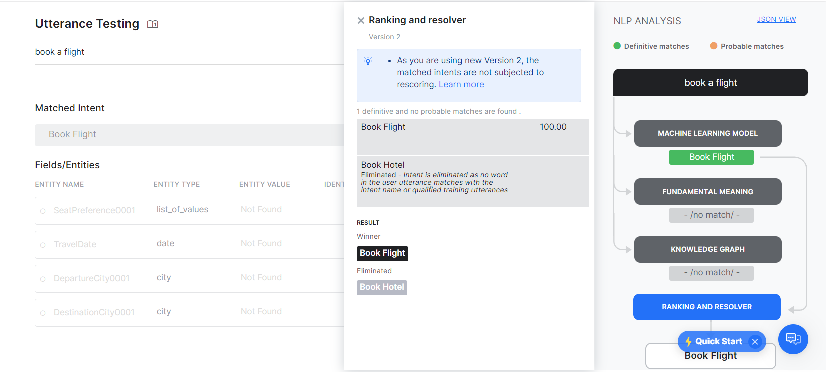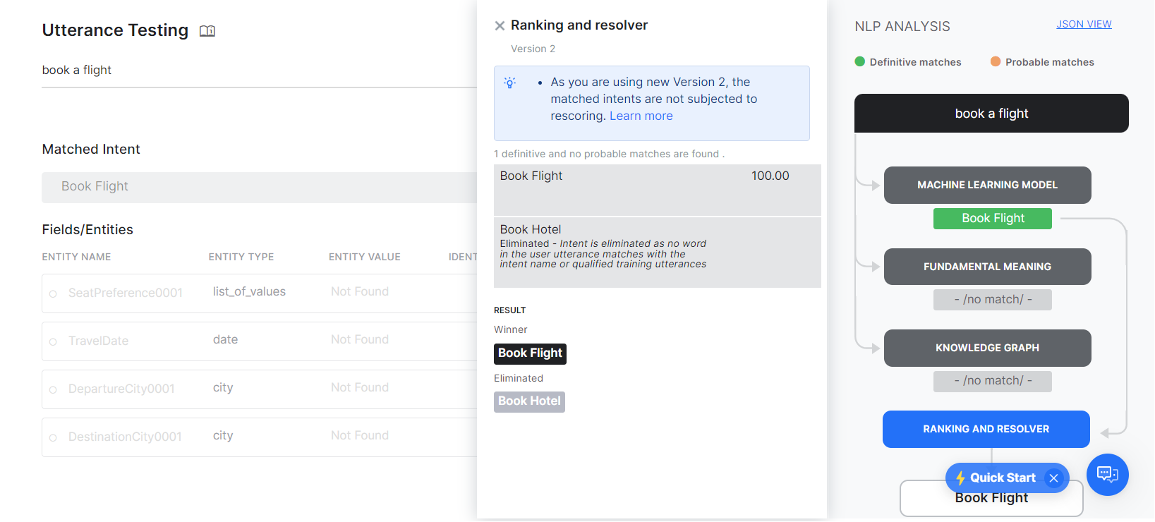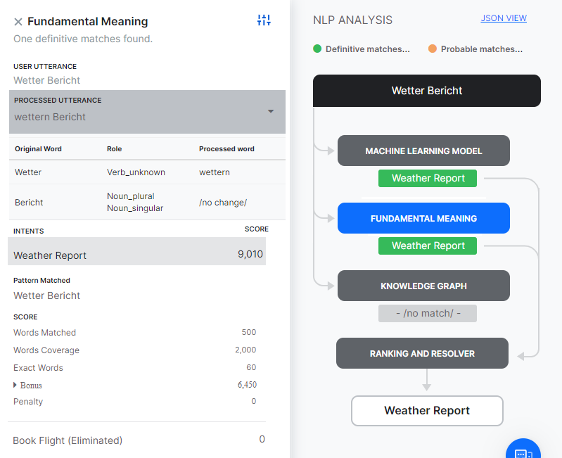 When you test a user utterance, in addition to the matching intents you will also see an NLP Analysis box that provides a quick overview of the shortlisted intents, the NLP models using which they were shortlisted, corresponding scores, and the final winner.