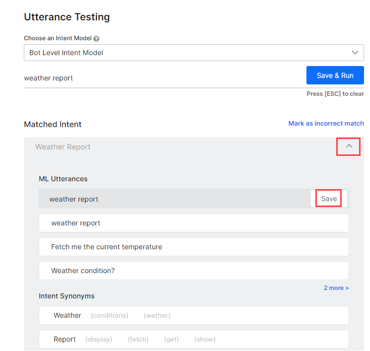 - The user utterance that you entered gets displayed in the field under the ML Utterances section. To add the utterance to the intent, click Save. You can add as many utterances as you want, one after another. For more information, read Machine Learning.
