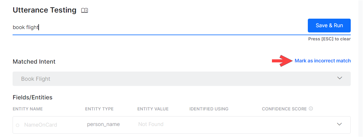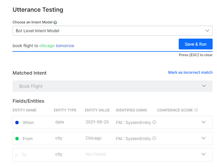 - Single Match (Possible or Definitive): The NLP engine finds a match for the user utterance with a single intent or task. The intent is displayed below the User Utterance field. If it is a correct match, you can move on to test the next utterance or you can also further train the task to improve its score. If it is an incorrect match, you can mark it as incorrect and select the appropriate intent.