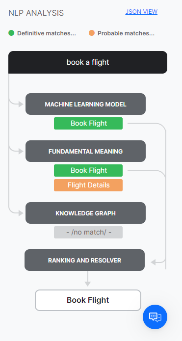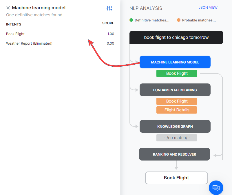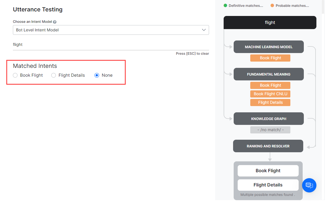 As mentioned above, the NLP engine uses Machine Learning, Fundamental Meaning, and Knowledge Graph (if any) models to match intents. If the NLP engine finds a single Definitive Match through one of the underlying models, you will see the task as the matching intent. If the test identifies more than one definitive match, you will receive them as options to pick the right intent.