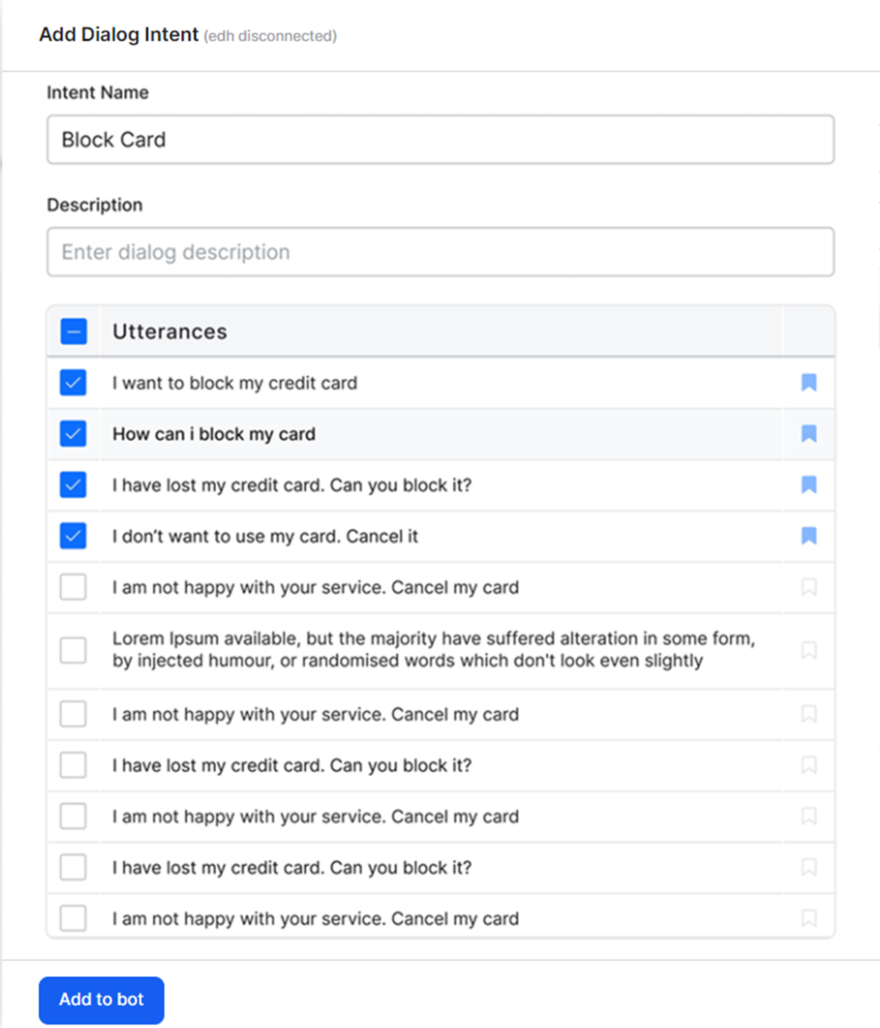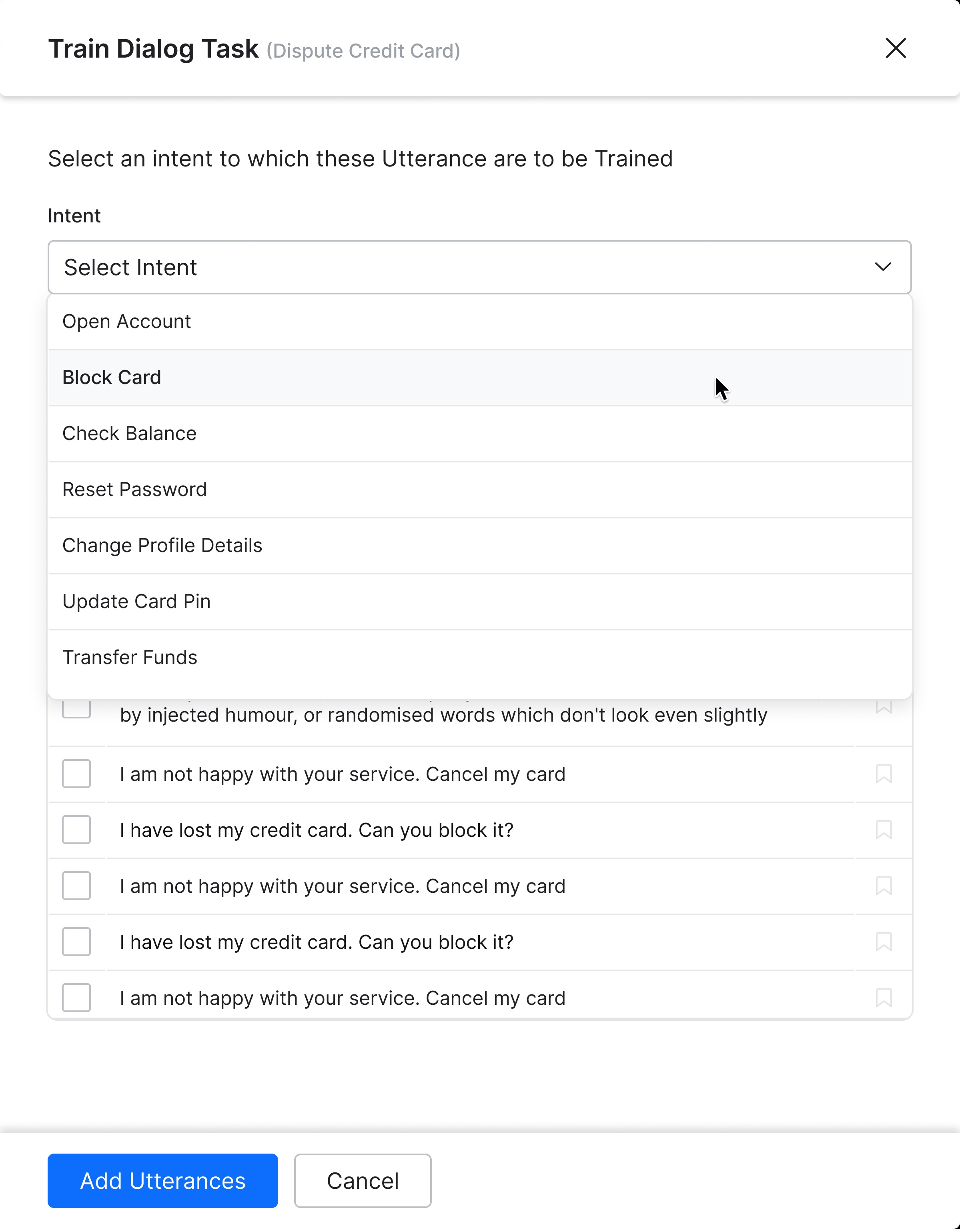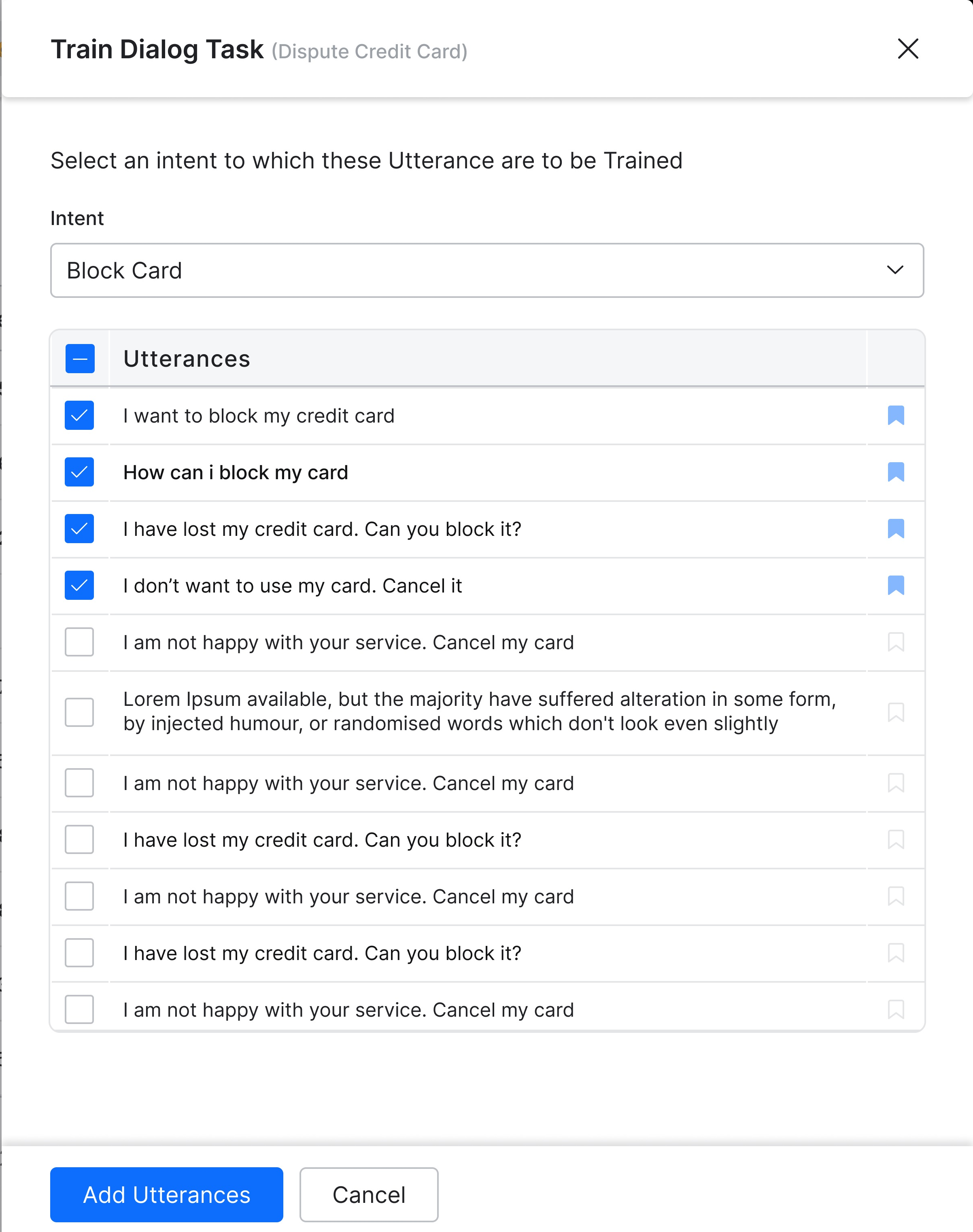 - Select the dialog task to be trained from the Intent drop-down and select all the required utterances from the table below. Click Add Utterances.