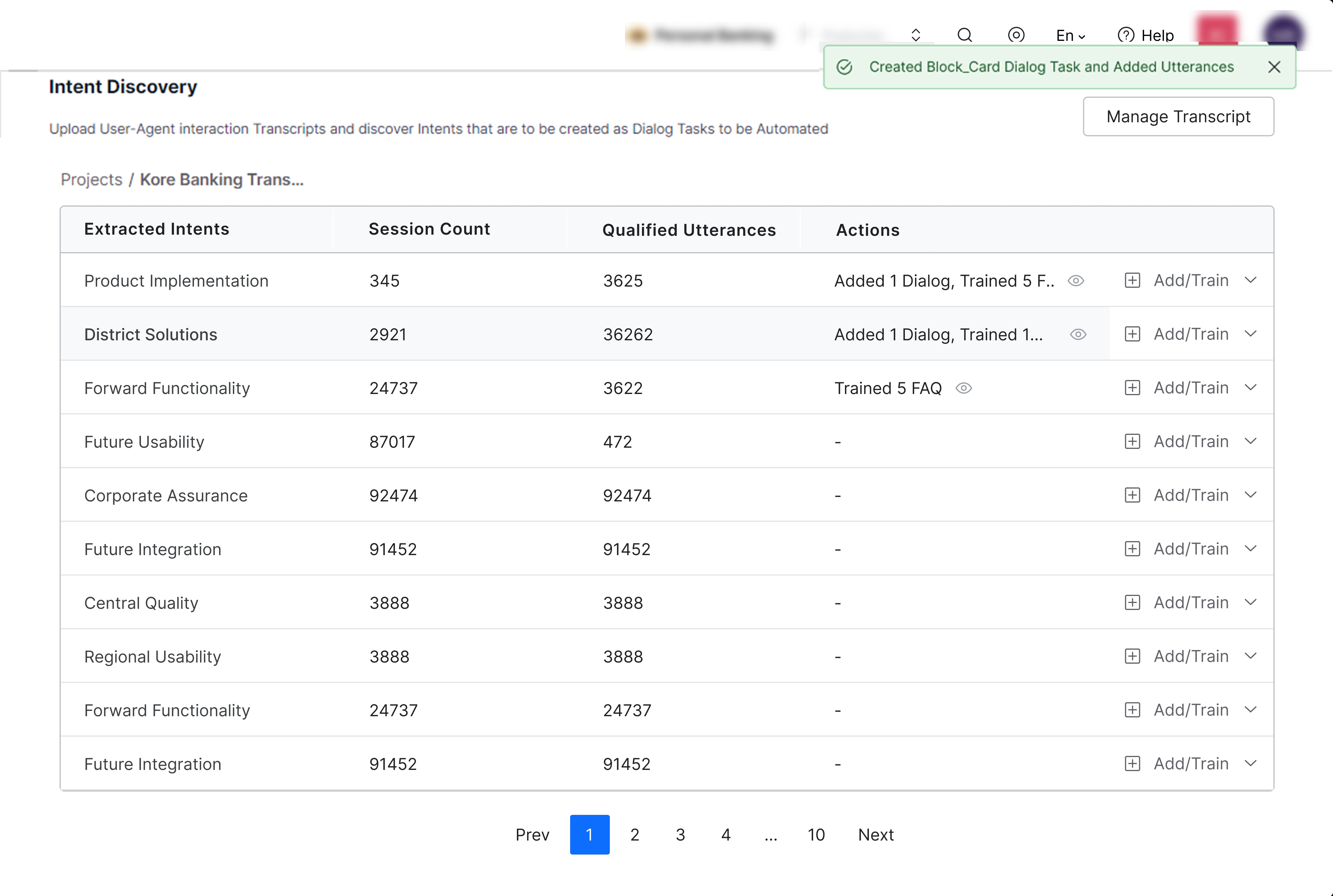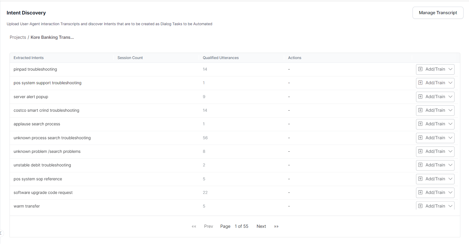 There may be instances where you may need additional intents in an existing project and can achieve the same by adding transcript files to the project. The steps to upload additional transcript files are the same as uploading transcripts to a new project. Intent extraction can be performed multiple times based on need. For example, if, after having extracted intents previously, there is a need to add more intents, you can upload additional transcripts and extract intents again. Also, existing but no longer relevant transcript files can be deleted from a project. These two features ensure that an existing project becomes reusable.