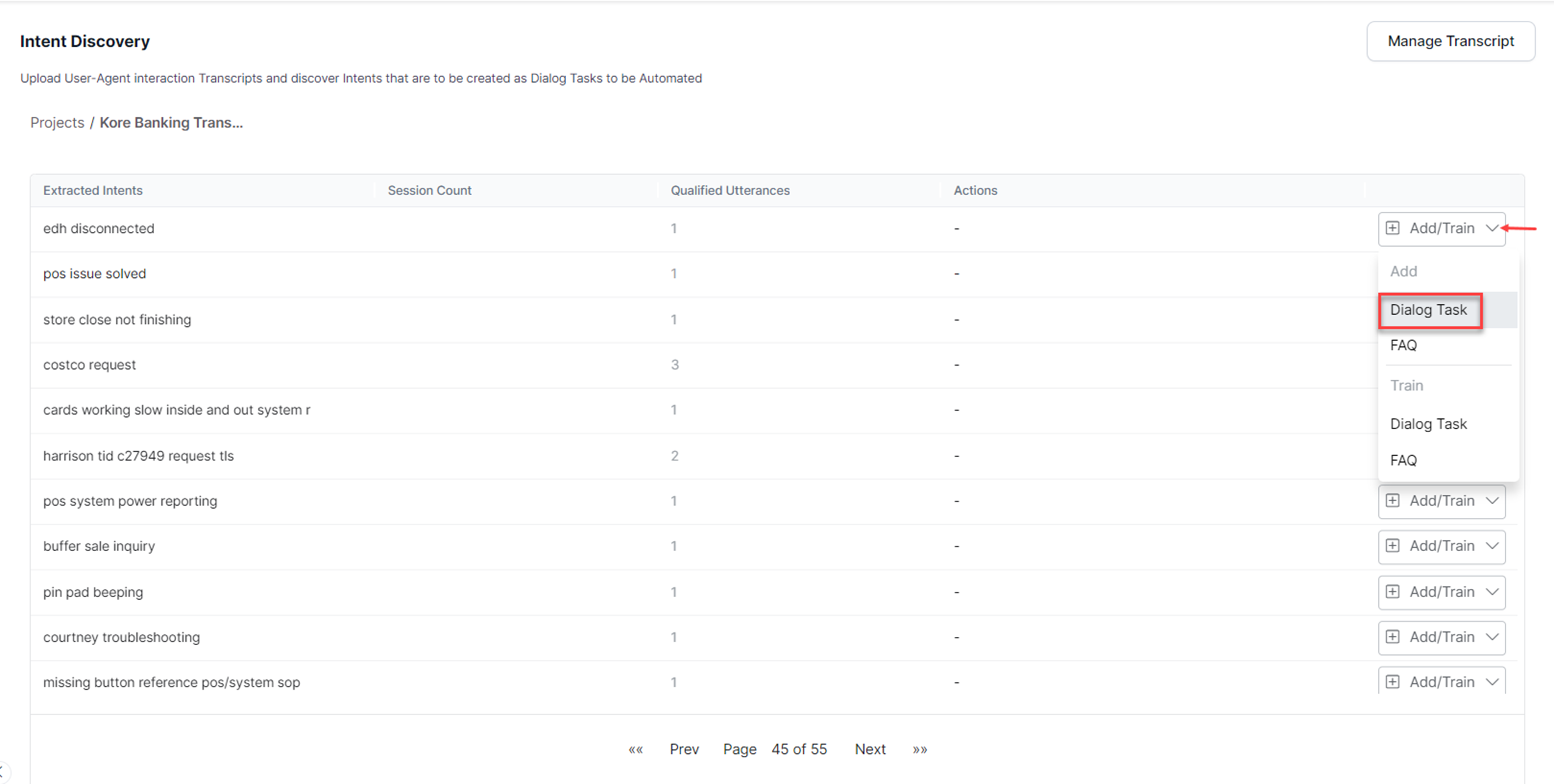 You can upload your historical transcripts in CSV format. After the transcripts are uploaded into the AI Agent to identify the different topics, intents, or conversations between the user and the AI Agent. It intelligently identifies all the intents available. You can review each intent to understand which conversations have resulted in identifying these intents. After the review, you can also see the underline utterances that resulted in identifying an intent. You can either add these intents as new intents for your AI Agent or pick specific utterances and train them as utterances for your existing dialogs and FAQs. So, it helps both ways – either create new intents or enhance the training you provide to your AI Agent.