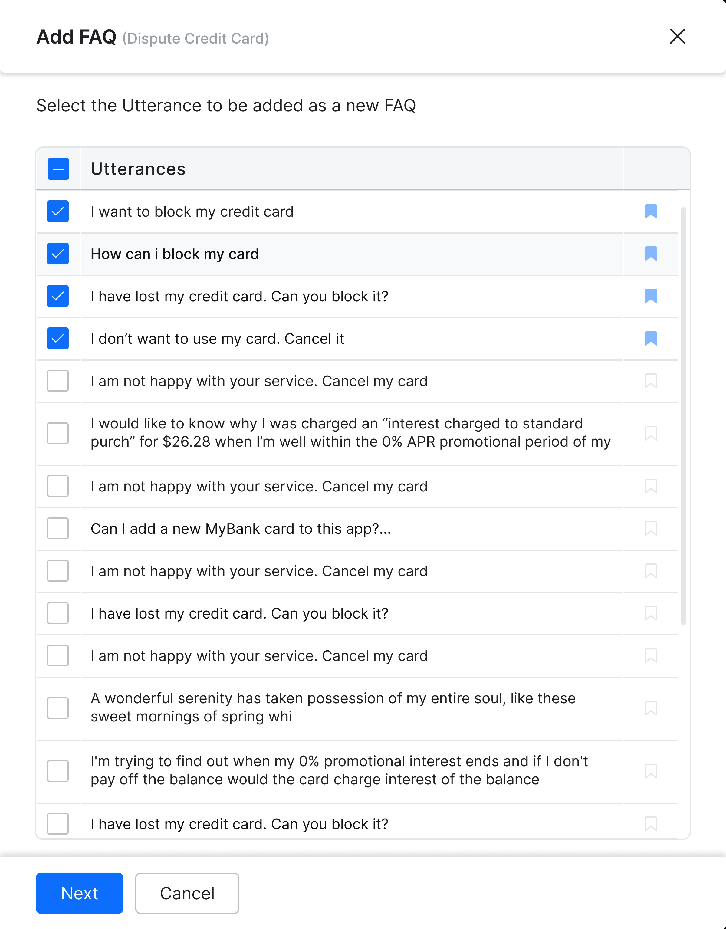 - All the Utterances qualified for the Extracted Intent are displayed in a table. The bookmark icon appears if the user has bookmarked this utterance in the Session summary dialog box.