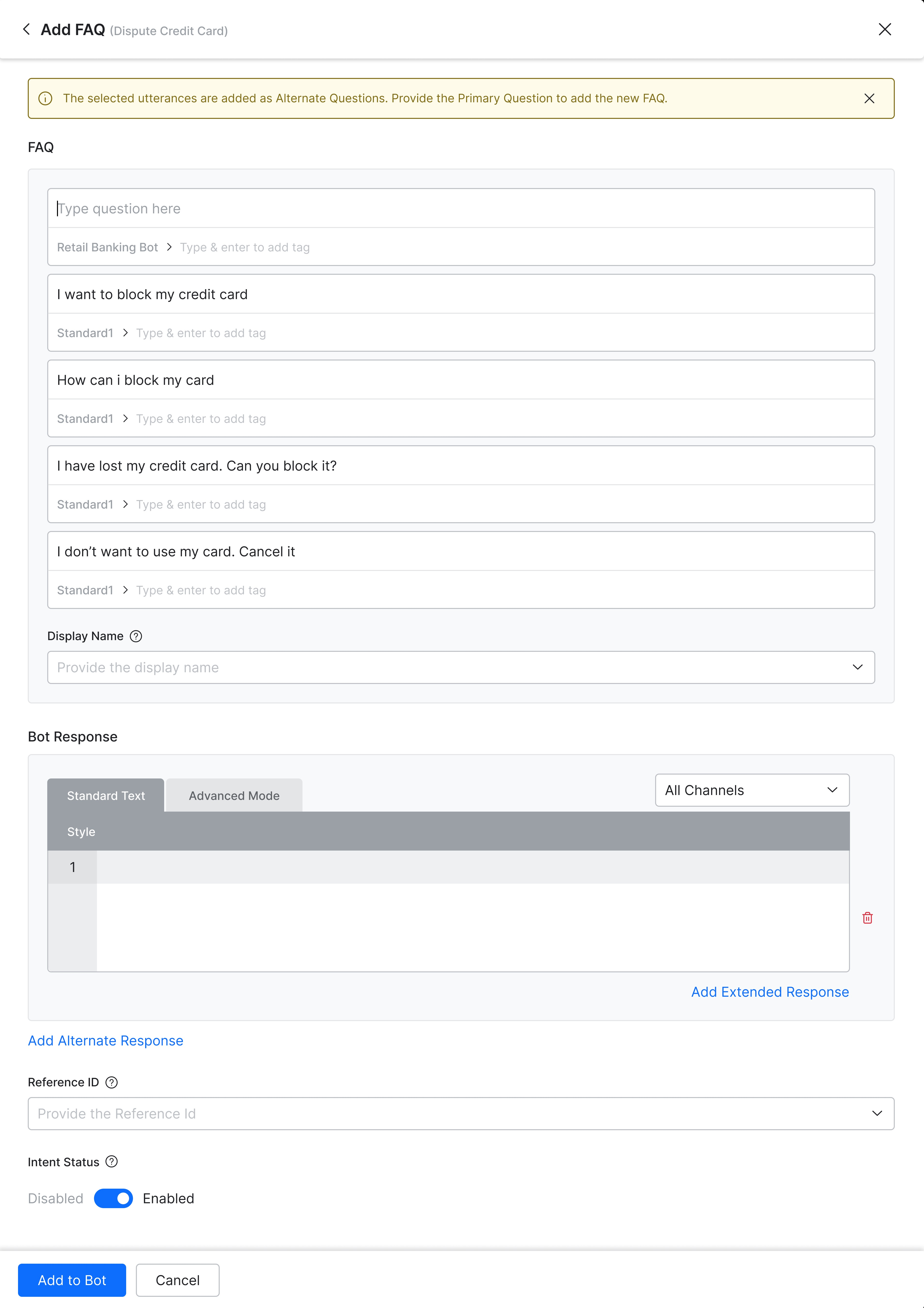 Provide or select other features of the FAQ, like AI Agent response channel, Display name, reference ID, etc. as per your need and preference, and click the Add to Bot.