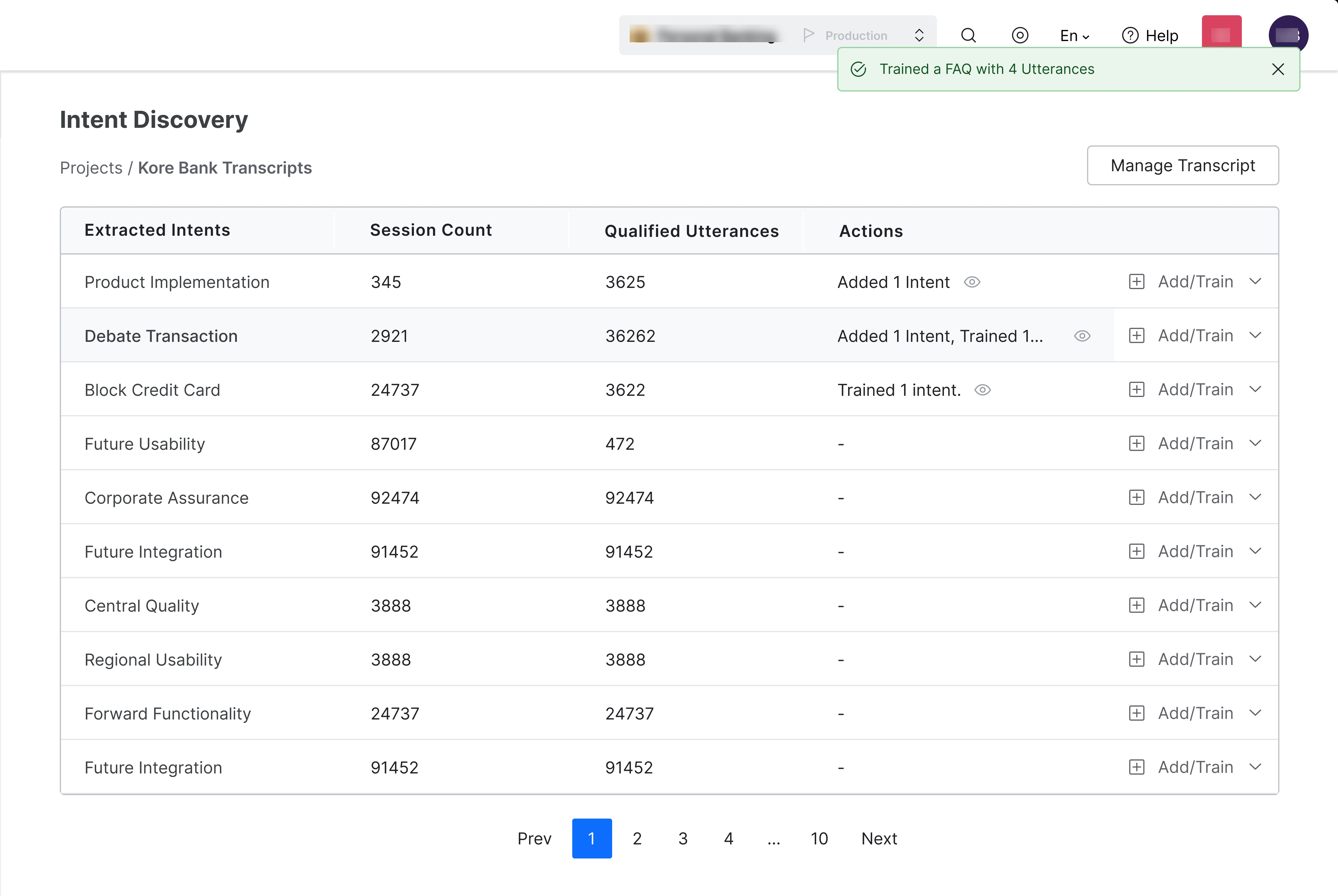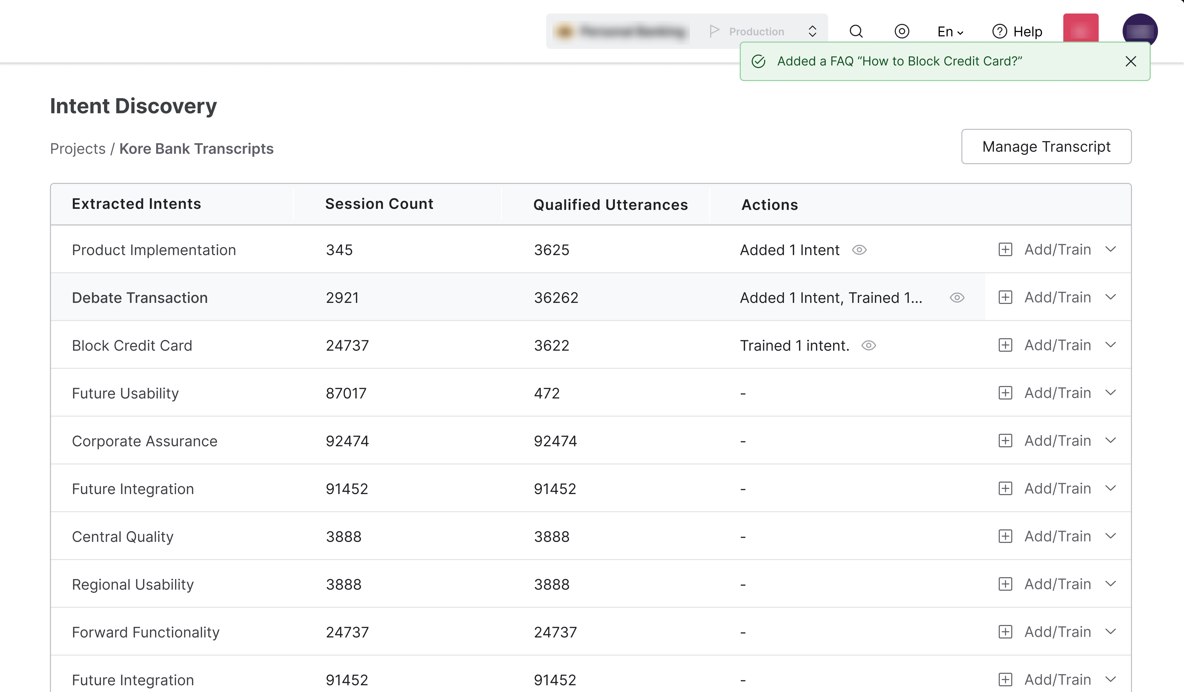 After the intent extraction is completed, you can see the list of extracted intents along with session count, qualified utterances, and actions.
