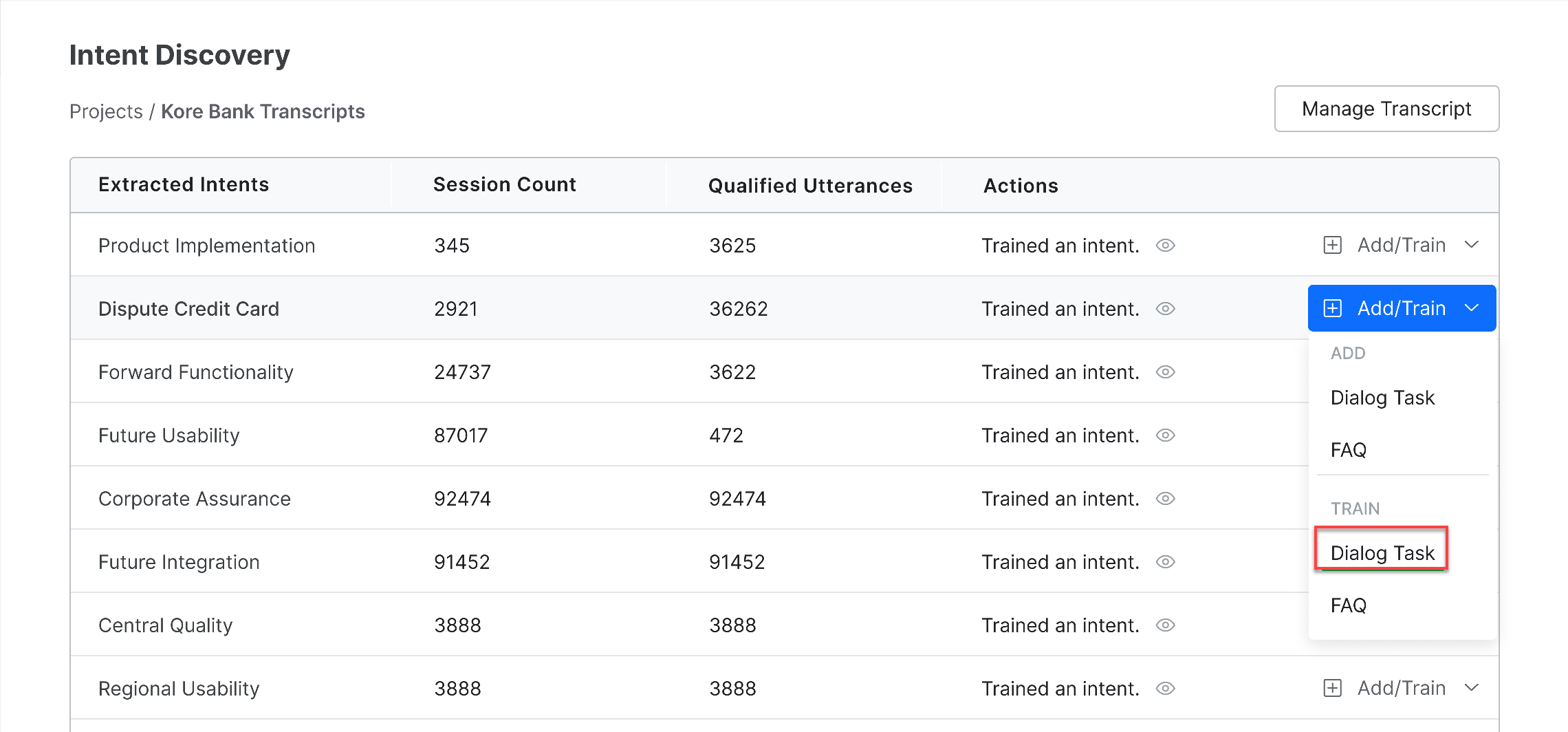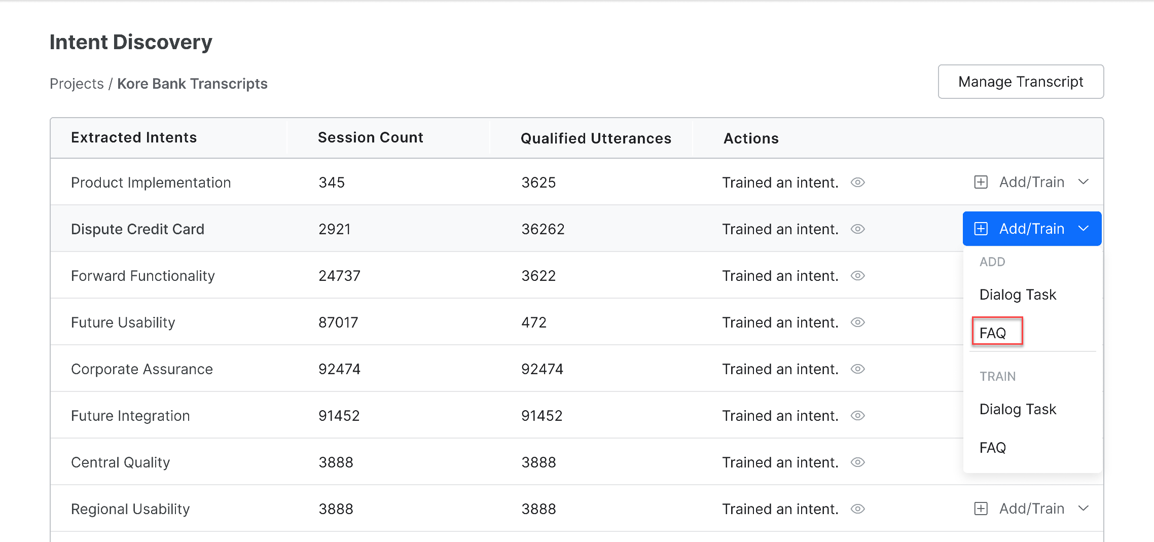 - Train the Utterances to create new intents or add them as training data: You can add new intents as dialogs or FAQs or train them for existing dialogs or FAQs.