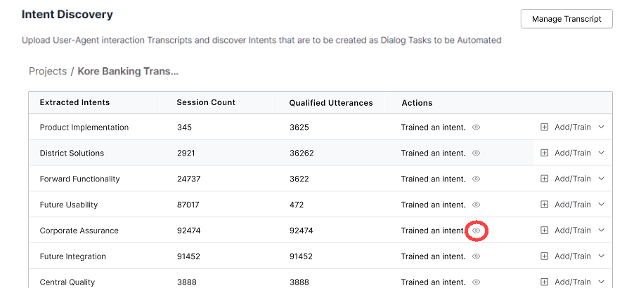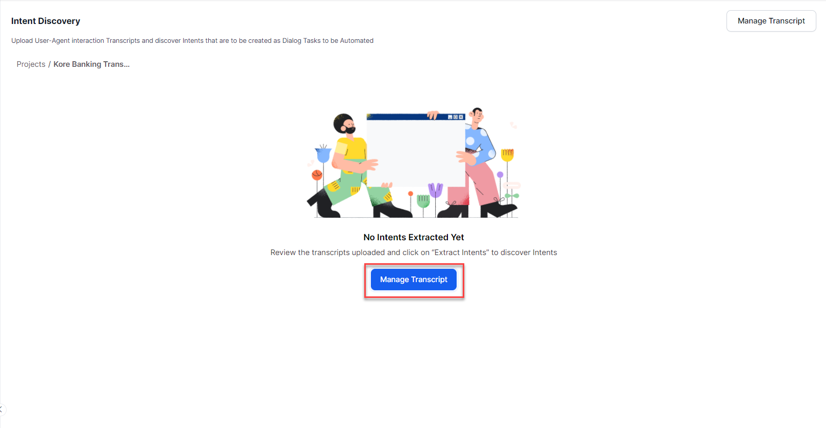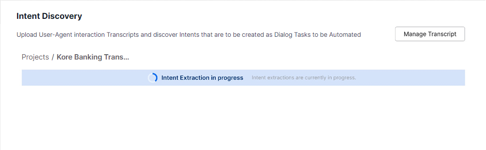 If some transcript files are uploaded but No intents extracted so far, the Manage Transcripts button is displayed as shown in the screenshot below.