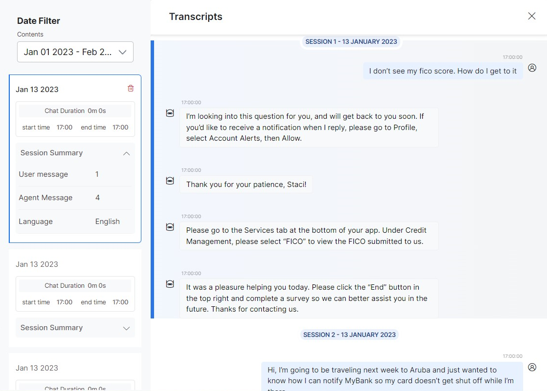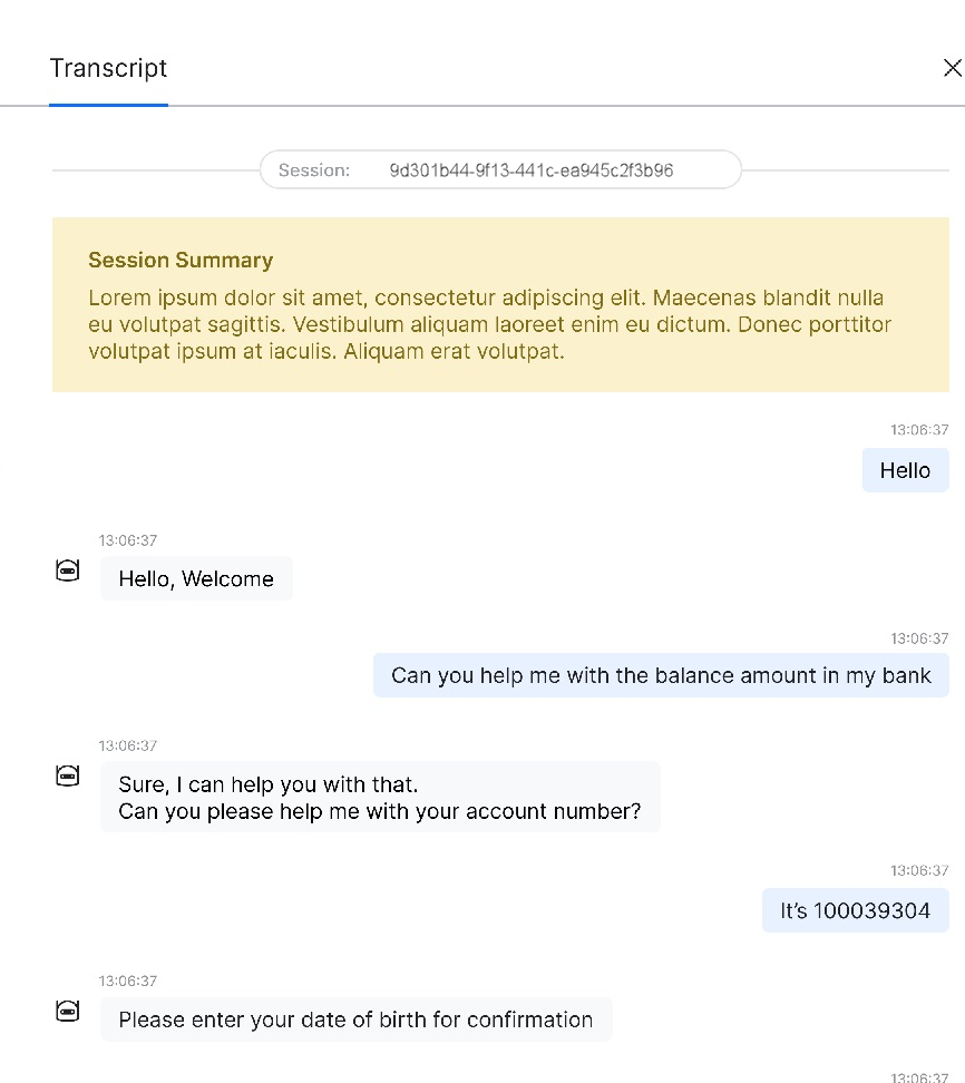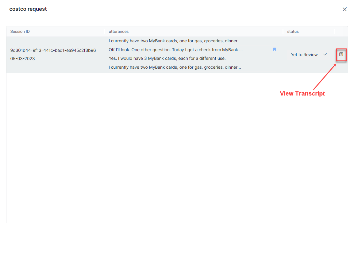 - View Transcripts action button: This button is present in the Status column of each row, next to the drop-down. It helps you view the detailed conversion of the Session. On clicking the icon, the Session Details dialog box is displayed.