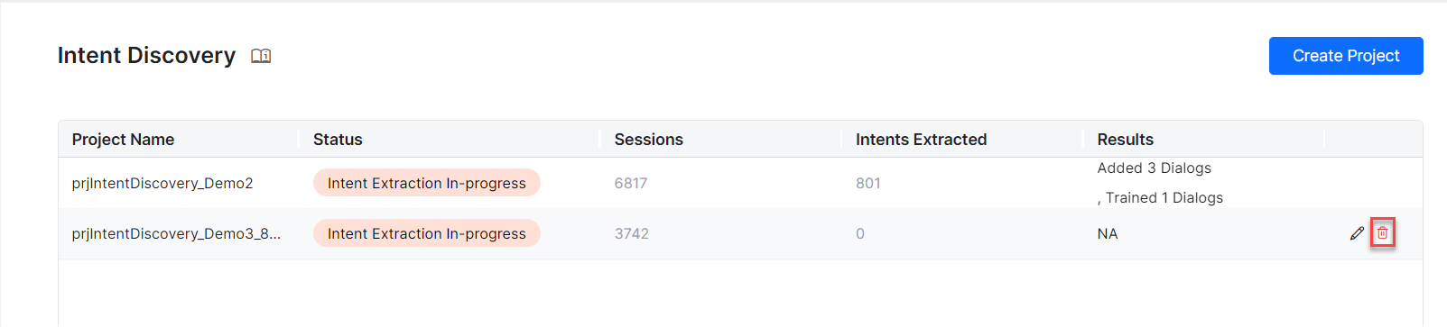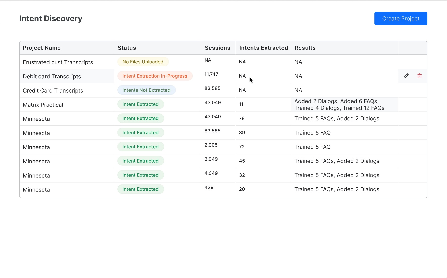 The Intent Discovery landing page lists all the projects with conversational insights for each project, such as the status of the project, number of sessions, intents extracted, and results in terms of added dialogs, added FAQs, trained dialogs, and trained FAQs. Note that the result will be NA for the projects for which intent extraction is incomplete.