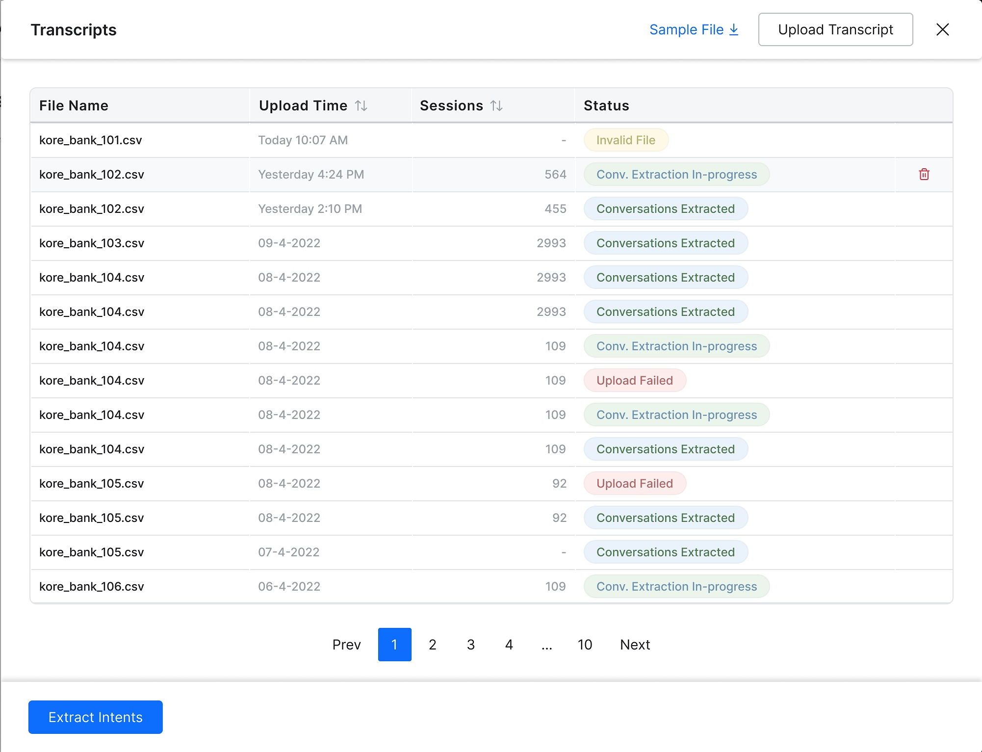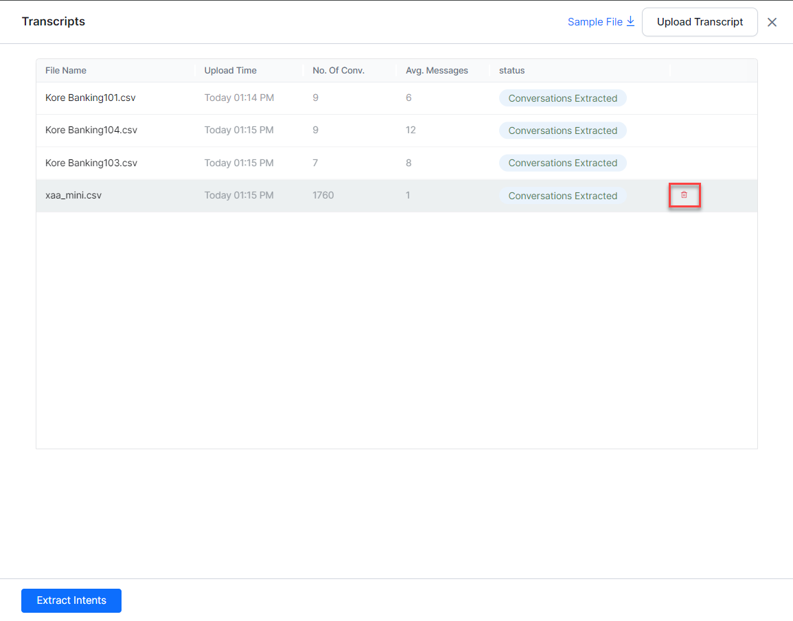 You can delete the uploaded transcript file if the file is not required anymore, in case the upload was incorrect, or if the conversation has been extracted but the file is not useful.
