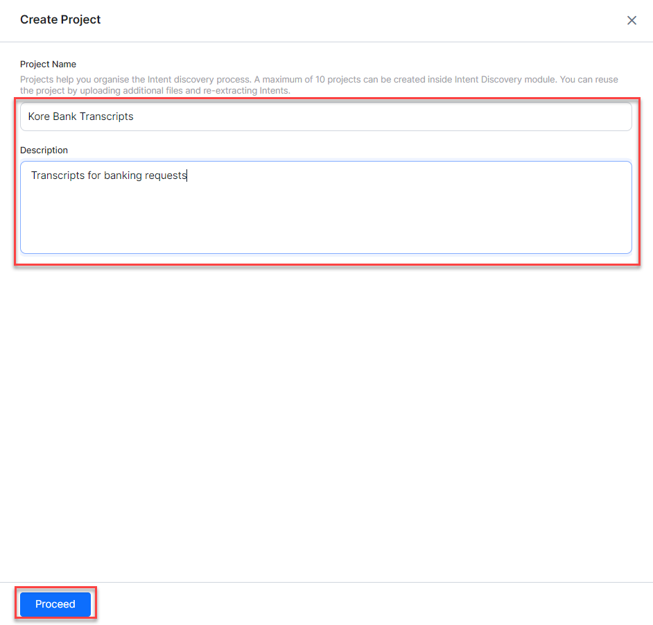 Enter a name and a brief description of the project. Note that the character limit for Project Name is 256, and Description is 1000. Click Proceed.