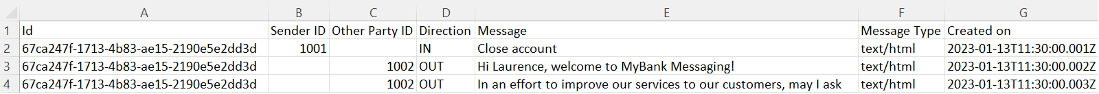 | Id | The session ID of the conversation. (For all the conversations in a session, the Id must be the same.) |