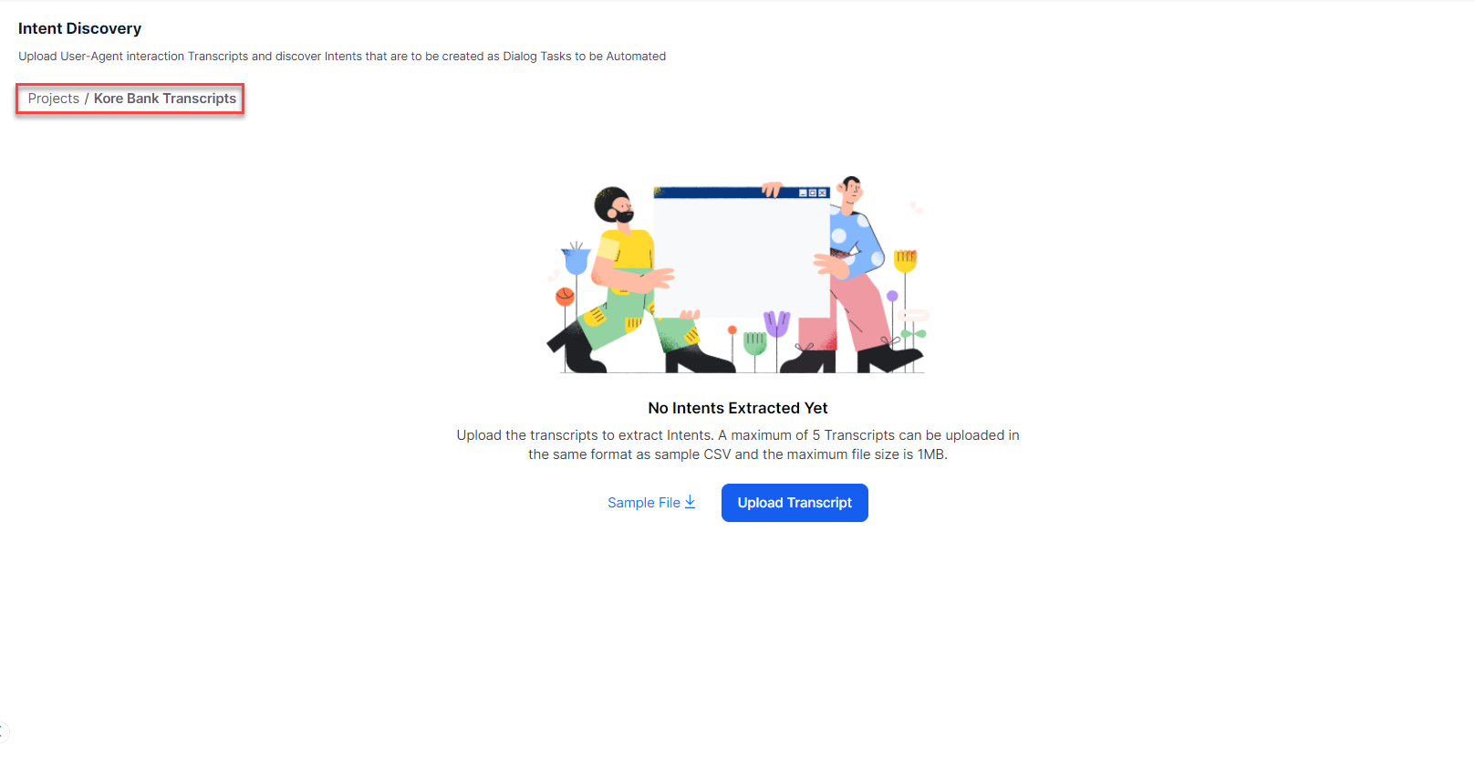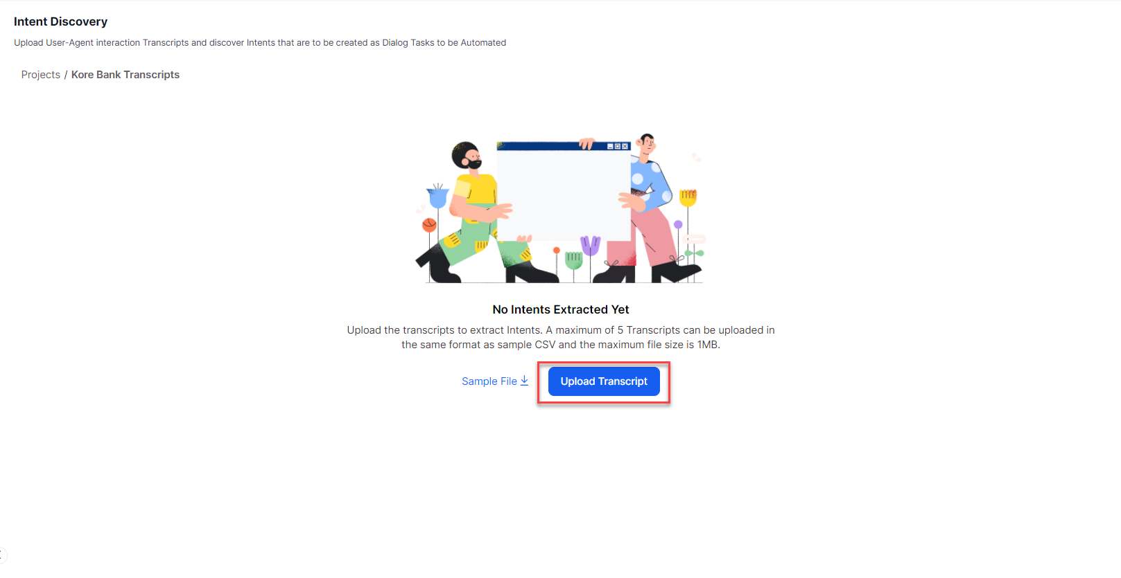 On the Intent Discovery page for the new project, you can see a button to initiate the upload of the transcript file(s) and a link to download a sample transcript file.