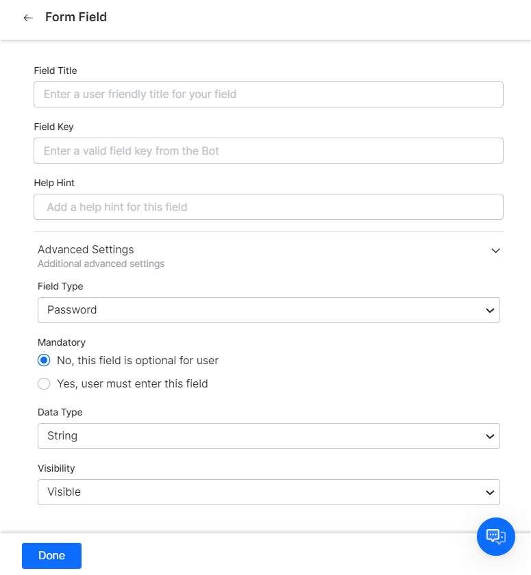 | Field Type | When Advanced Options is selected, specify the type of field displayed in the end-user interface to collect the user input assigned as the value for the Field Key, one of: