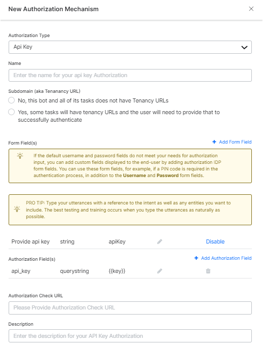 Ensure that your selected Authorization Type is API Key. Below is an illustration of the fields that you will need to provide information for in order to authorize the API.