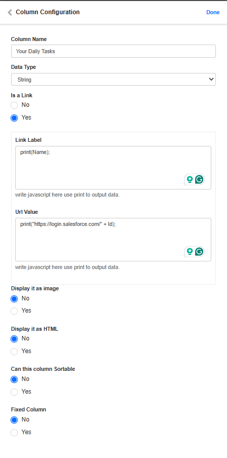 If Is a link is not enabled, then enter the JavaScript to display the value for the column, for example,
