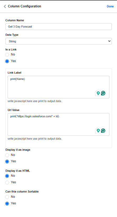 If Is a link is not enabled, then enter the JavaScript to display the value for the column, for example,