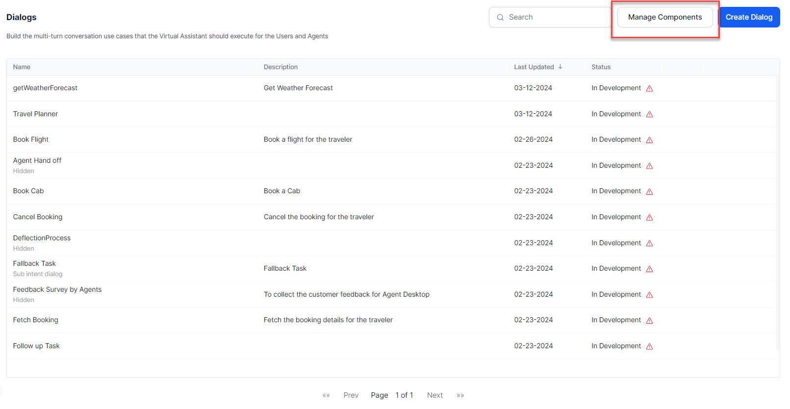 Your App can have many dialog tasks with related components. You can use the Dialog Editor to create, review, and edit a single dialog task for an app. However, to better visualize and understand relationships and settings for all dialog tasks in an app, you must use the Manage Components feature.