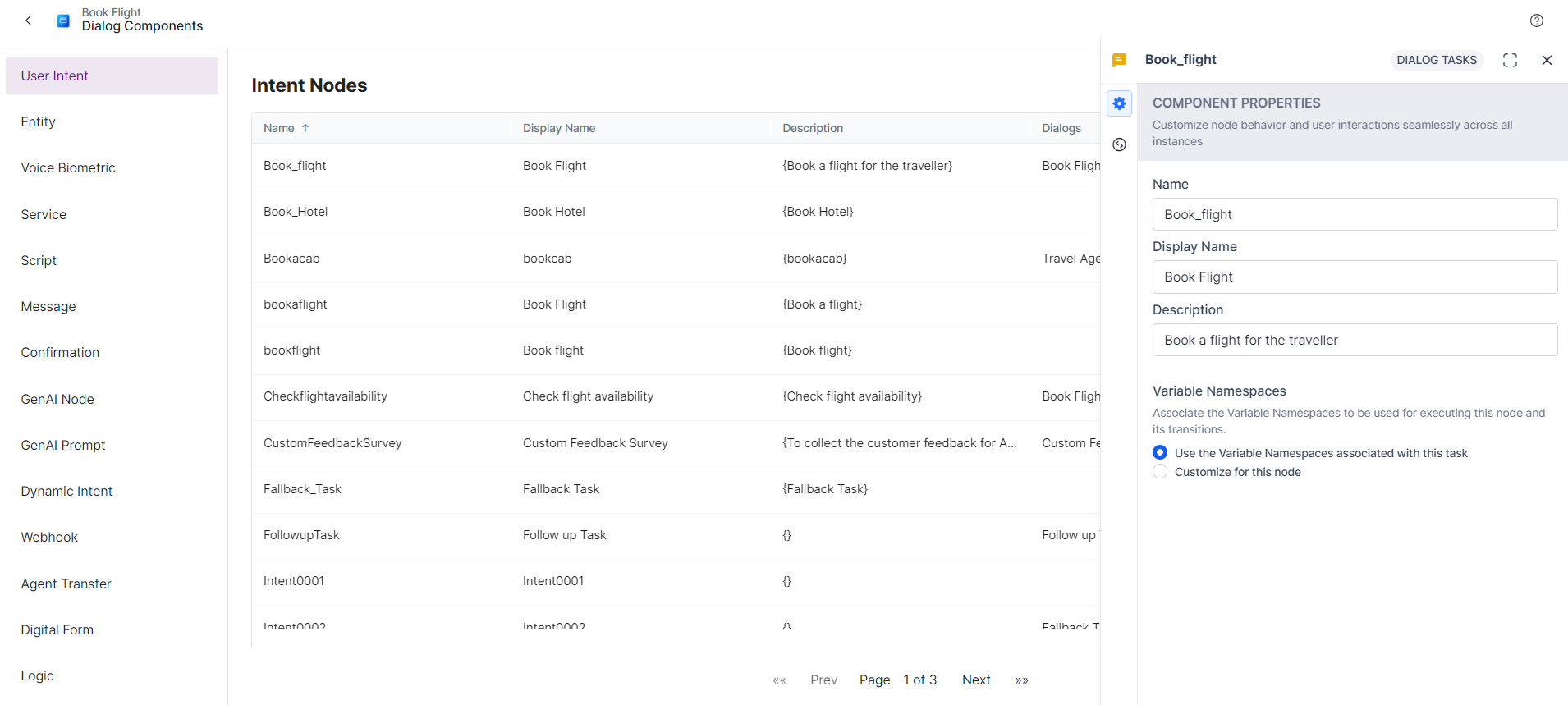 | Agent Node, Agent transfer, Bot action, Confirmation, Form, Logic, Message, Process, Prompt node, Script, Webhook | Name, display name, dialog tasks used in |