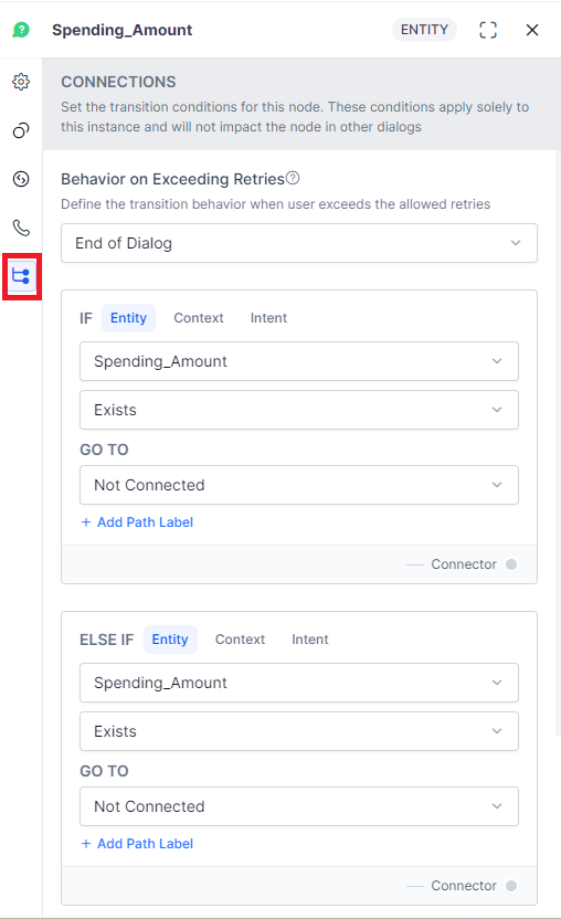 - Primary Intent nodes do not allow connection conditions at all. You can only choose the next node to connect to. Intent nodes that follow other nodes within the Dialog Task do allow connection conditions, keeping in mind that the Intent criterion only allows you to set a follow up intent using the context object.