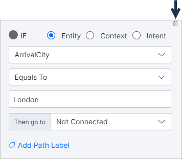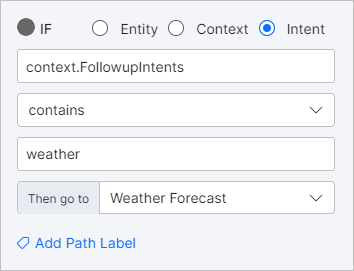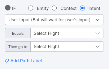 - If– This condition is used to direct the conversation on a specific path, if specific criteria are met. The If condition lets you configure Entity, Context and Intent criteria.