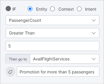 For example, if you are working with a travel app and are setting up a Book a Flight dialog task, you might want to provide a specific offer for group reservations. So, if during the conversation, the AI Agent detects a certain number of passengers, you may want to direct the conversation to one path or another, depending on that number. Say for instance, if the passenger count is 5 or less, present the standard offer; otherwise present a promotional offer.