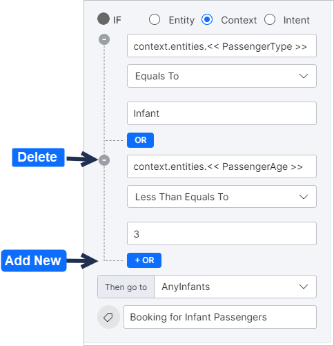 For example: If the Passenger Type(context object – entity) equals to(operator) Infant(value) OR if Passenger Age(context object – entity) is less than or equal to(operator) 5(value), then trigger the node that manages the booking process for infants.