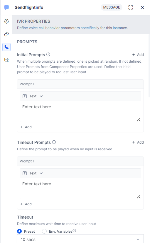 Use the IVR properties tab on the Message Node to define the initial prompts, timeout prompts, no match prompts, and error prompts with customization for the retries behavior, input mode, grammar settings for Global and Node level use cases, prompts, and call behavior parameters for this node to use in IVR Channel. These settings are defined at the Message Node level. For more information, read the Voice Call Properties article.