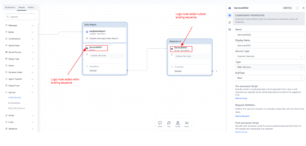 Add a Service node in the designated place. For steps related to adding nodes, add node to dialog.