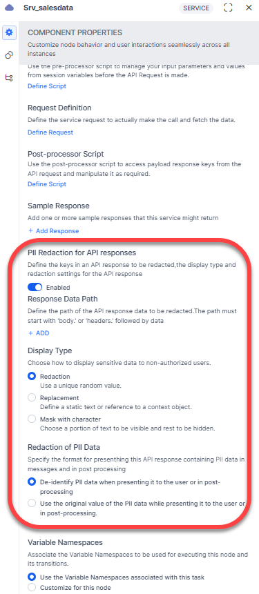 PII redaction requires you to specify exact paths to the fields you want to redact. PII redaction applies only to Custom Service nodes.