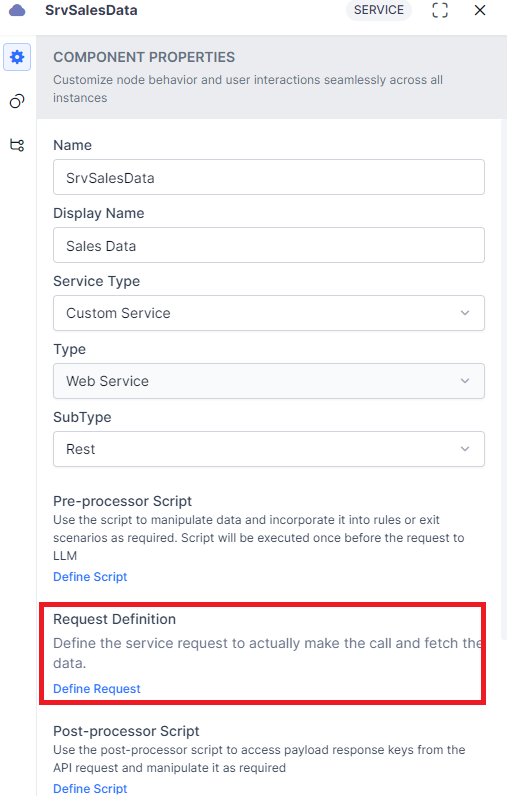 The Service Node is a component type in a dialog task that you can use to add an API service to make REST or SOAP requests to third-party web services. You can use this node when you have the parameters needed for the API request using an entity or other nodes to capture the user input.