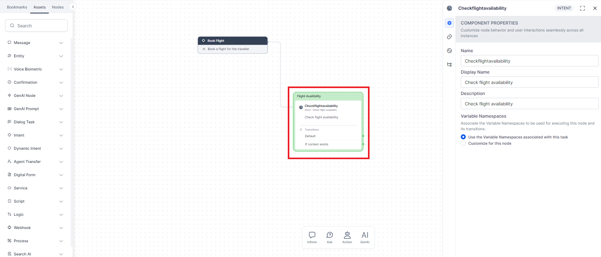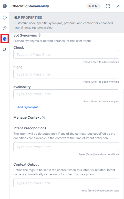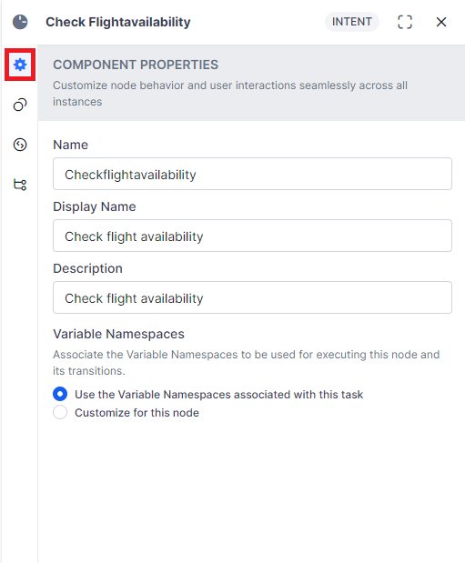 The configurations you set up or edit in the Component Properties tab reflects in all the dialog tasks that use this node. These settings are the same for Intent and Sub-intent nodes.