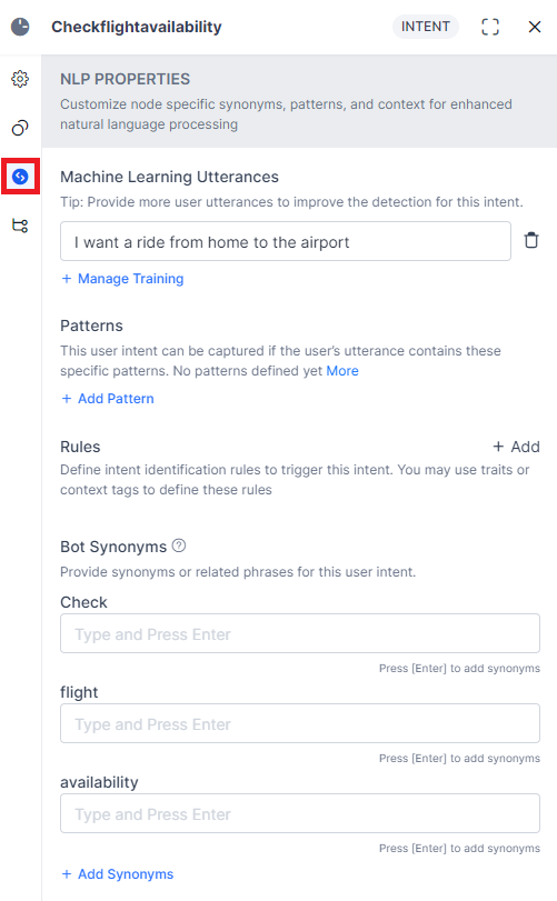 - Machine Learning settings to provide user utterances to improve the detection of this intent. Learn more.