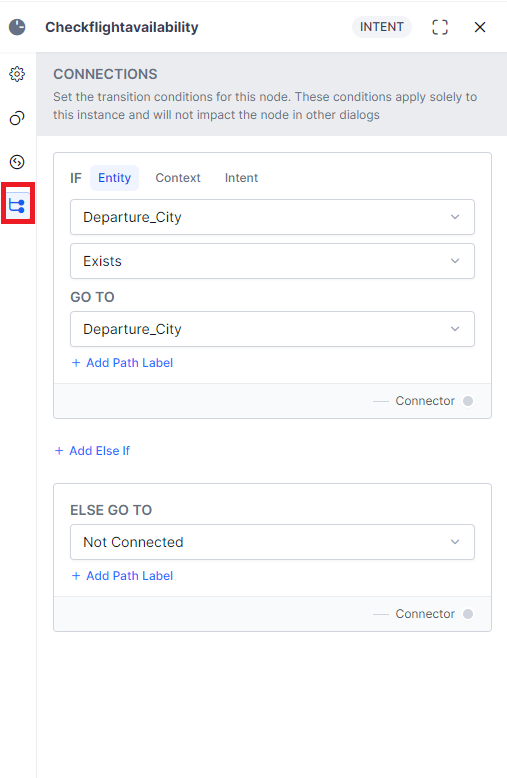 If the Intent node you are working with does not represent the primary intent within the dialog task (if it follows another node), you can write conditional statements based on the values of any Entity or Context Objects in the dialog task, or you can use intents for transitions. For details on how to work with connection conditions, please see Adding IF-Else Conditions to Node Connections.