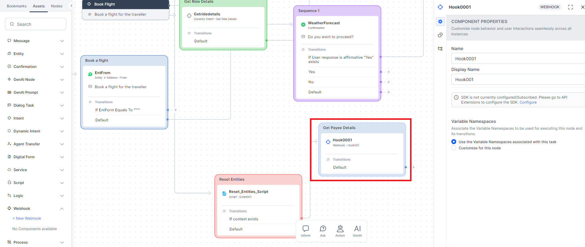 You can use the WebHook node to subscribe to a message and to WebHook events that capture real-time data from real-time events and show them to the user. You can use the WebHook node for server-side validation, execute business logic, or make backend server API calls. Also, you can use the SDK Tool BotKit to add event handlers and control the messages and WebHook events as required by connecting the WebHook node to a script node to process the response.