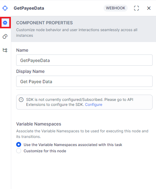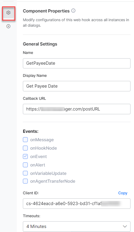 - All changes made to the Component Properties tab will affect all instances of the Webhook Node across Dialog Tasks.