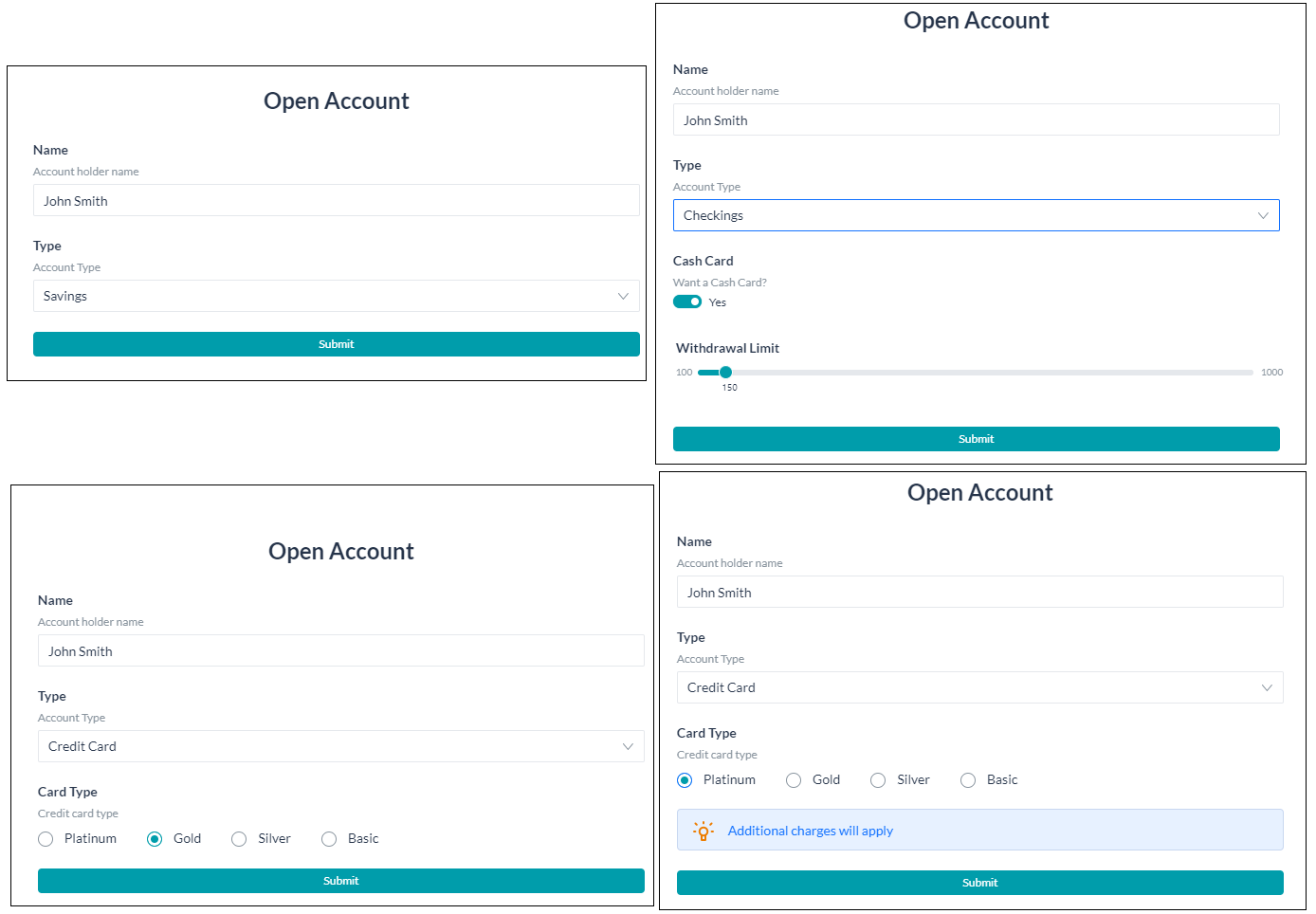 - Checkings – Whether Cash Card is required, if yes then the maximum withdrawal limit (range between $100 to $1000) to be enforced on that card;