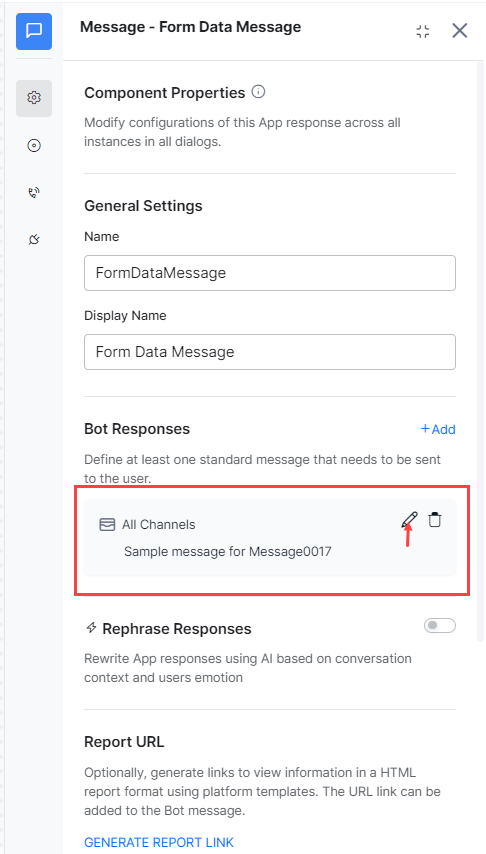 Hover on the Sample Bot Response for All Channels and Edit icon to open the message editor.