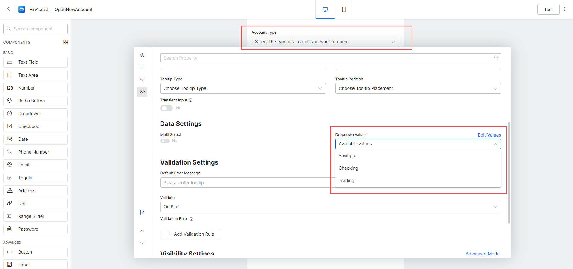 Next, a selection box for the type of account to be opened. Drag and drop a Dropdown component onto the form and set the following values: